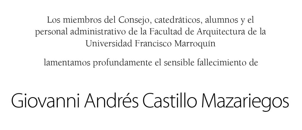 Los miembros del Consejo, catedráticos, alumnos y el personal administrativo de la Facultad de Arquitectura de la UFM lamentamos profundamente el sensible fallecimiento de Giovanni Andrés Castillo.