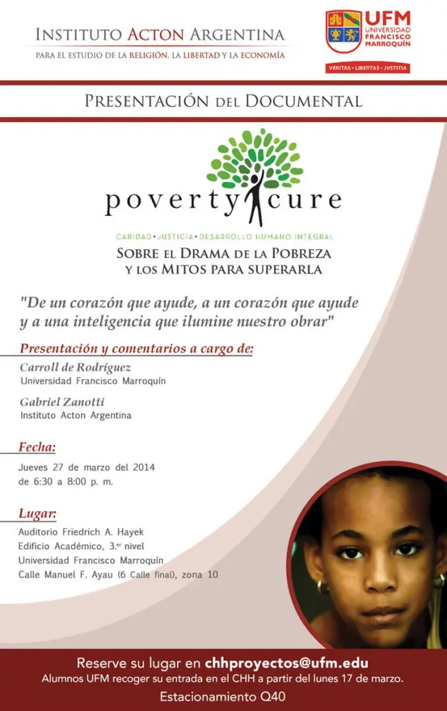 Un documental sobre el drama de la pobreza y los mitos para superarla. Presentación y comentarios a cargo de Caroll Ríos de Rodríguez y Gabriel Zanotti. Jueves 27 de marzo de 2014 de 6:30 a 8:00 p.m. en el Auditorio Friedrich A. Hayek.