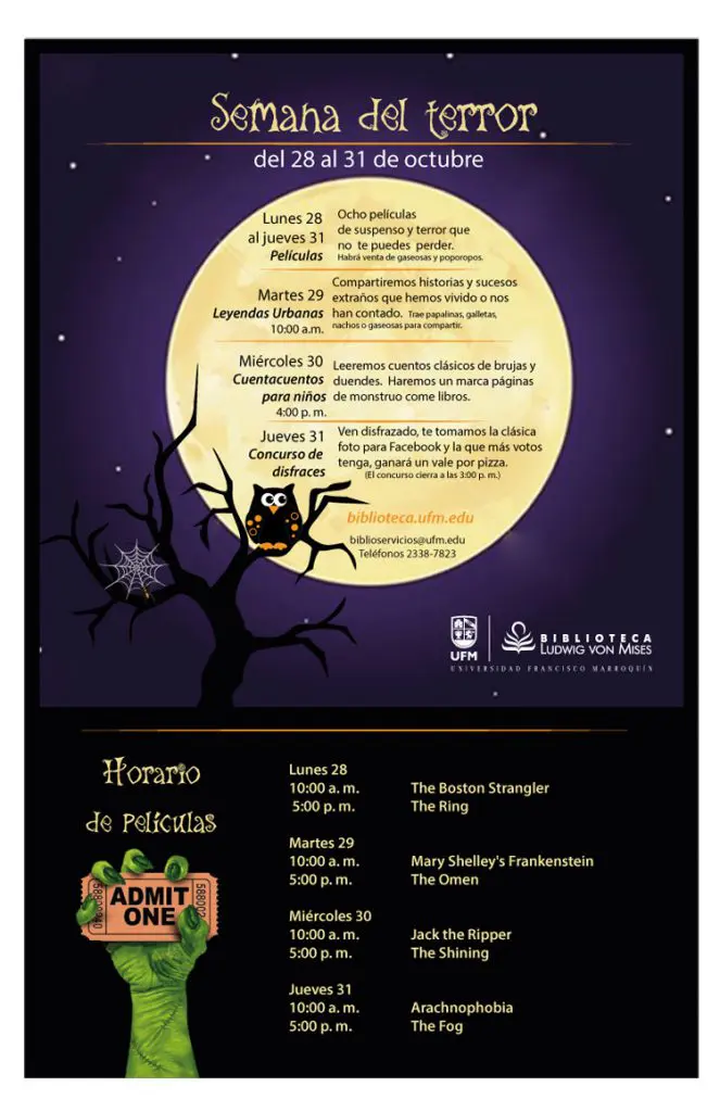 Películas de suspenso y terror, leyendas urbanas, cuentacuentos y concurso de disfraces.