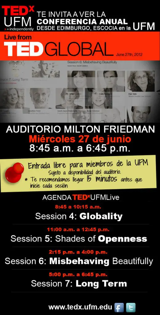 TEDxUFM te invita a ver la conferencia anual desde Edimburgo en el Auditorio Milton Friedman el miércoles 27 de junio de 8:45 a.m. a 6:45 p.m.
