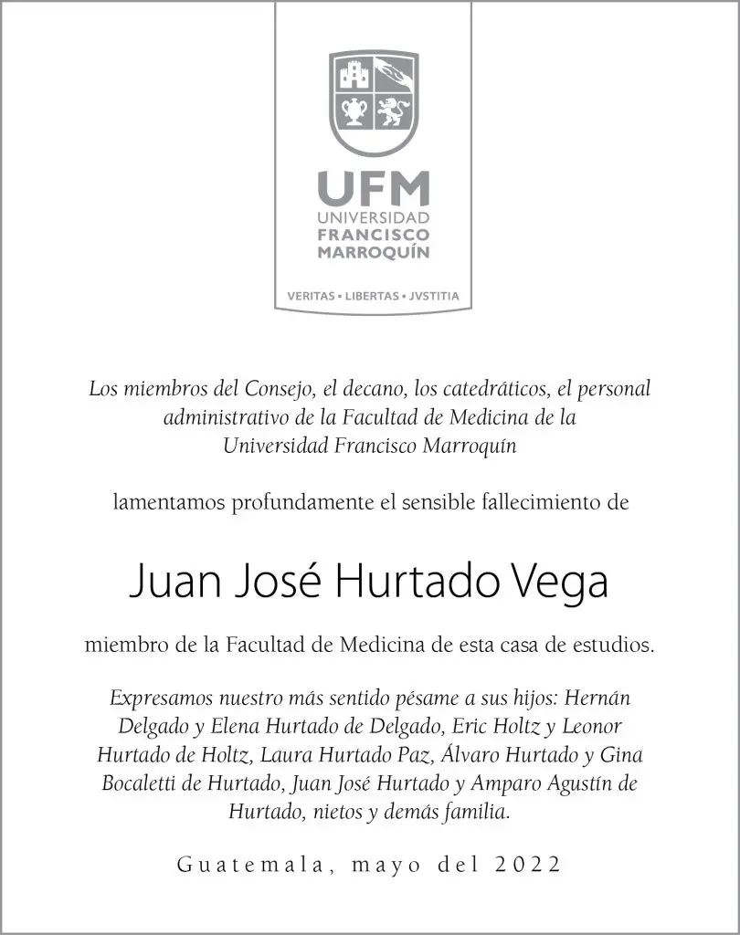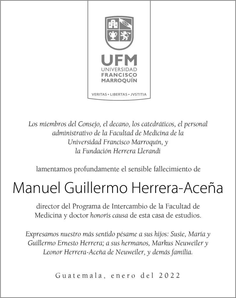 Los miembros del Consejo, el decano, los catedráticos, el personal administrativo de la Facultad de Medicina de la Universidad Francisco Marroquín, y la Fundación Herrera Llerandi lamentamos profundamente el sensible fallecimiento de Manuel Guillermo Herrera-Aceña
