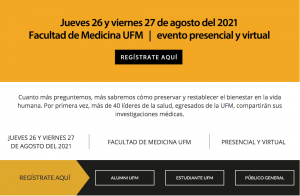 Organizado por la Facultad de Medicina de la UFM, la cita es jueves, 26 y viernes, 27 de agosto de 2021; de 8:00 a. m. a 3:00 p.m. (-6 UCT). De forma presencial, o virtual.