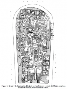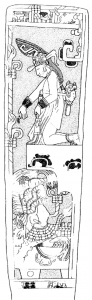 En una estela de Piedras Negras se logra ver justo la escena del ritual para asperjar incienso. El gobernante saca el incienso del recipiente que tiene en la otra mano.  Y el verbo en la escritura es exactamente igual.